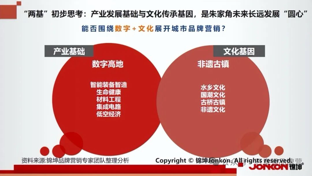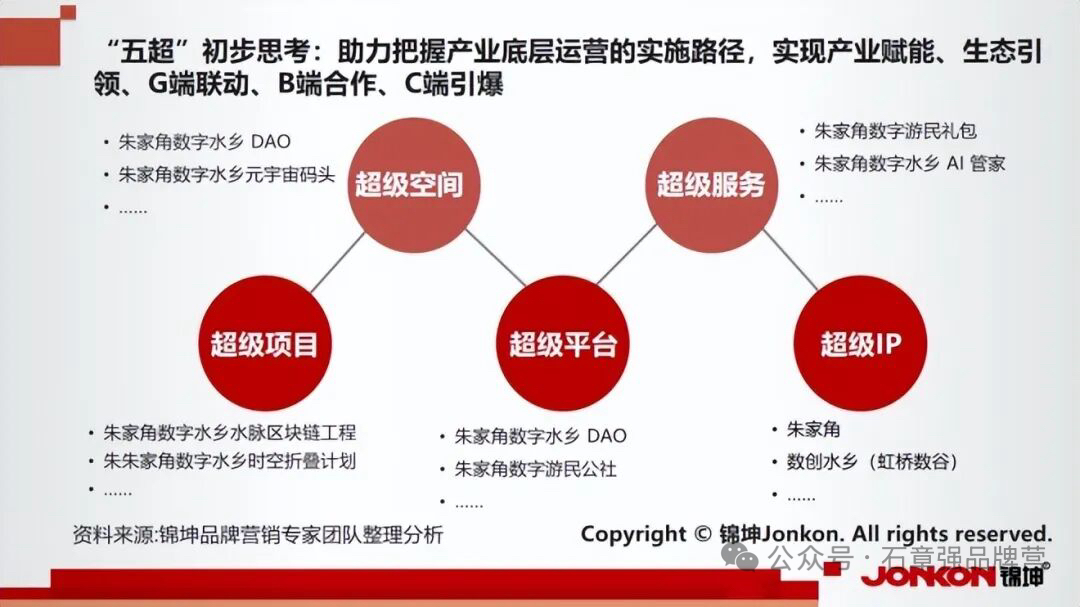 面对众多古镇的激烈竞争格局,作为400多家专精特新企业、300多个行业第一品牌、200多个上市公司、100多个城市品牌和50多个世界500强企业背后的产城园企品牌服务商,锦坤品牌专家议朱家角古镇可着眼于当下火爆的数字经济领域,打造差异化核心品牌 ——“数创水乡”或”虹桥数谷“,以全球首个 “数字孪生水乡” 综合体作为品牌定位。