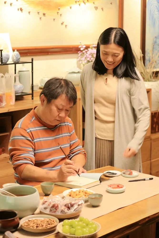 女主人李冬君匠心独运,用宣纸糊了一墙的书架背板,然后命刘刚悬腕书字,儿子也要在上面挥几笔水墨,给书架锦上添花,而且是每年春节前“大扫除”节俗的一项轮值。书香氤氲墨香,读书人的家风。