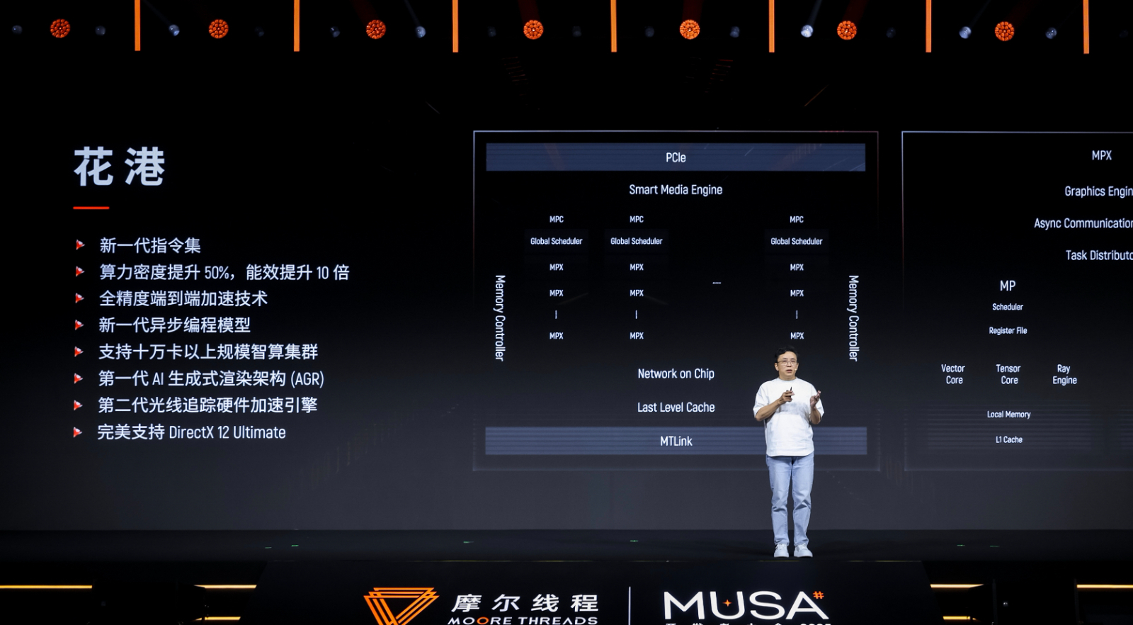 根据现场信息,其最新的“花港”架构,最核心的变化在于计算密度的提升与对低精度的支持,摩尔线程官方数据显示,相较于上一代产品,新架构的算力密度提升了50%,效能提升了10倍。